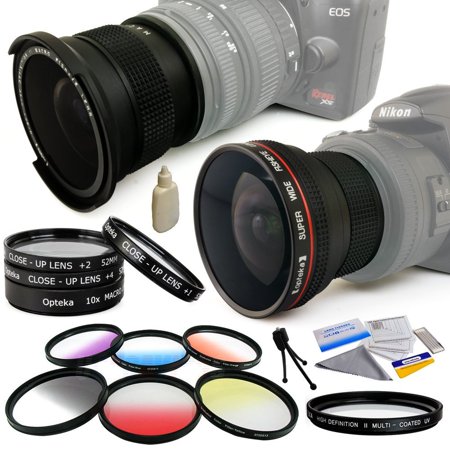 52M Opteka .43x High Definition II Wide Angle Panoramic Macro Fisheye Lens for Digital CamerasFront filter thread: 67mm180Deg Degree CapabilityProfessional High Speed Auto FocusFull Panoramic CapabilityAF Infrared CompatibleHigh Resolution Precision Optics, Day or Night52MM Opteka 2.2x High Definition II Telephoto Lens for Digital CamerasHigh-index / low-dispersion optical glassDigital Multi-CoatedHigh speed auto-focus / Infrared compatibleMaximize day and night shots by providing maximum light and image transmissionBuilt-in macro lens for extreme close-up shots52MM Close-Up Set (+1, +2, and +4) with 10x Macro Lens52MM HD2 Professional 3 Piece Filter Kit (UV, CPL, FLD) UV FilterCircular Polarizing Filter Fluorescent Filter52MM Multi-Colored Graduated &