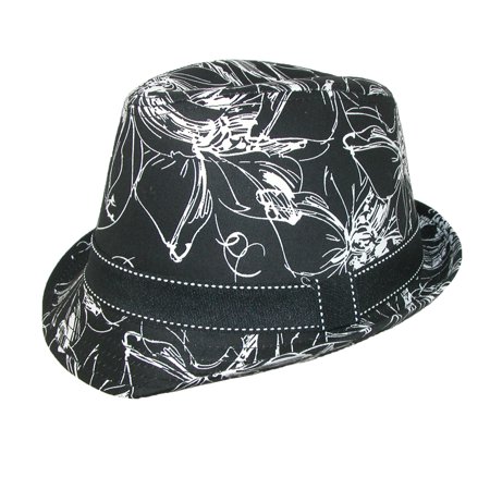 Made of 50% Cotton, 50% Polyester Made from 50% Cotton, 50% Polyester Stylish hat to complete your outfit Features a 1.5 inch black ribbon band Unique black and white flower print One size fits most up to 22 inches This stylish fedora hat is great to complete your outfit