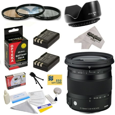 Sigma 17-70mm f/2.8-4 DC Macro TSC OS HSM Lens for Nikon D40 D40x D60 D3000 D5000 with 3 Pro Filter Kit, Lens Hood, 2 EN-EL9 Batteries, Cleaning Kit, Screen Protectors, Microfiber Cloth, $50 Gift Card