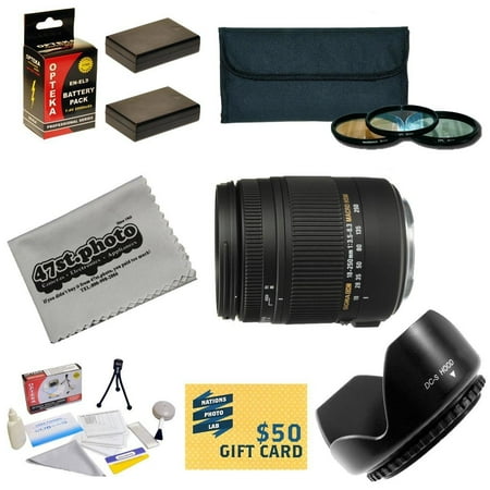 Package Contents: Sigma Super Zoom 18-250mm f/3.5-6.3 DC Macro OS HSM Lens for Nikon62mm Opteka High Definition II Professional 3 Piece Filter Kit (UV, CPL, FLD Lens) Flower Lens Hood2 Extended Life Replacement Battery Packs for the Nikon EN-EL9 2000MAH Each 4000MAH in TotalDeluxe Lens Cleaning KitLCD Screen ProtectorsMini Tripod47stphoto Microfiber Cloth$50 Photo Print