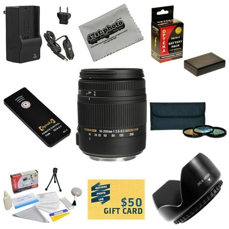 Package Contents: Sigma Super Zoom 18-250mm f/3.5-6.3 DC Macro OS HSM Lens for Nikon62mm Opteka High Definition II Professional 3 Piece Filter Kit (UV, CPL, FLD Lens) Flower Lens HoodExtended Life Replacement Battery Pack for the Nikon EN-EL9 2000MAH1 Hour AC/DC Battery ChargerWireless Shutter Release Remote Control3 Year Extended Lens WarrantyDeluxe Lens Cleaning KitLCD Screen ProtectorsMini Tripod47stphoto Microfiber Cloth$50 Photo Print Gift Card!